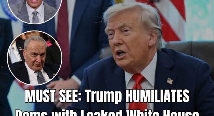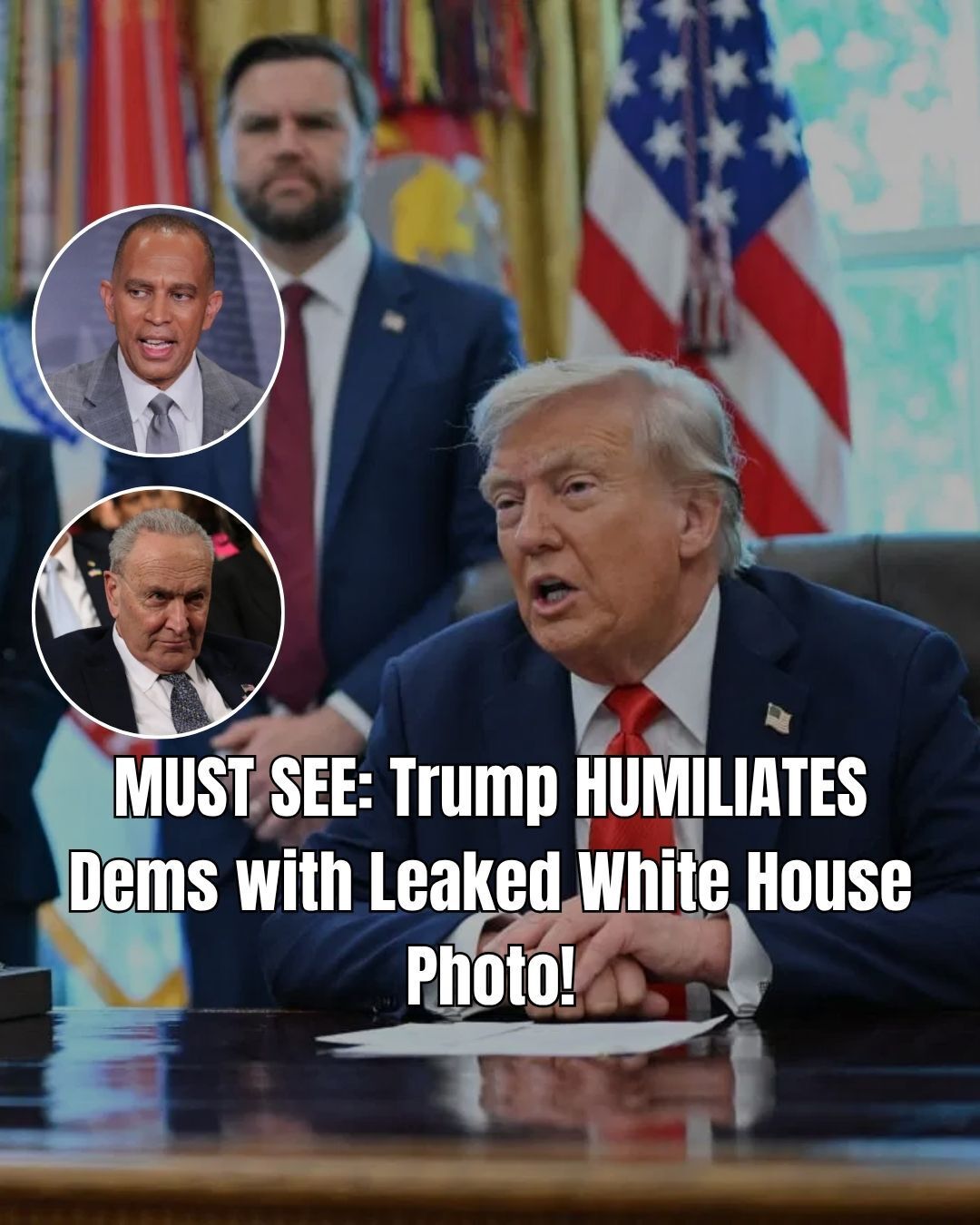 The president shared on social media a photo taken during a White House meeting the previous day, showing Democratic leaders arriving for negotiations. In the image, House Speaker Hakeem Jeffries (D-N.Y.) appears to glance sideways as Trump points in his direction with a smile.