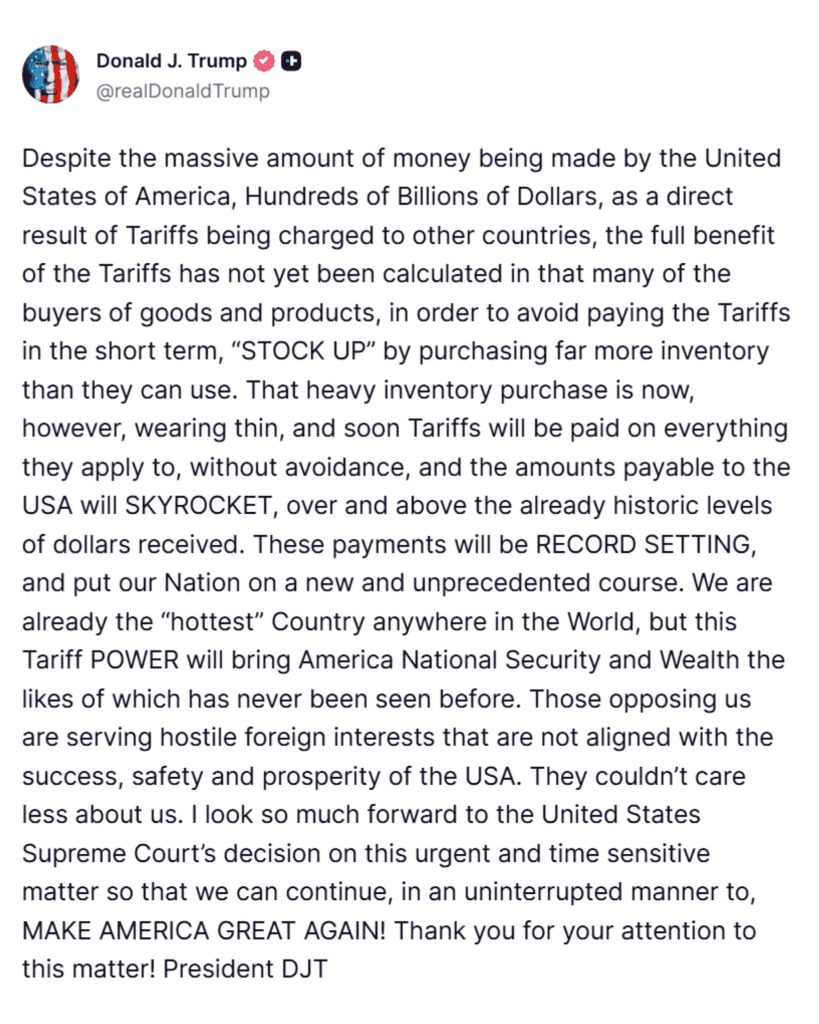 Trump’s defiance, penned from Mar-a-Lago’s sun-drenched verandas where he’d just sealed a $200 billion Saudi energy pact, radiates the unshakeable optimism that’s his superpower, a leader who sees not threats but triumphs in the tariff tempest. “I look so much forward to the United States Supreme Court’s decision on this urgent and time sensitive matter so that we can continue, in an uninterrupted manner, to MAKE AMERICA GREAT AGAIN!” he proclaimed, his faith in the Roberts Court—a majority he helped forge with Gorsuch, Kavanaugh, and Barrett—a vote of confidence in justices who’ve upheld IEEPA in past cases like the 2020 TikTok ban. The president’s foresight shines in the “stock-up” caveat, a savvy nod to the 2019 importer frenzy that delayed $80 billion in duties, now wearing thin as inventories dwindle—U.S. Commerce data shows a 22% drop in Chinese imports since Q1 2025, forcing Beijing to the table for a Phase Two deal that could add $100 billion in U.S. ag exports. “The amount of money made by the United States from Tariffs is, and will be, RECORD SETTING,” Trump assured, his crystal ball backed by Treasury projections: $80 billion collected in 2025 alone, skyrocketing to $400 billion annually if upheld, a revenue rocket that funds the Great Border Security Act’s walls and the Biggest Tax Cut’s rebates without touching Social Security.